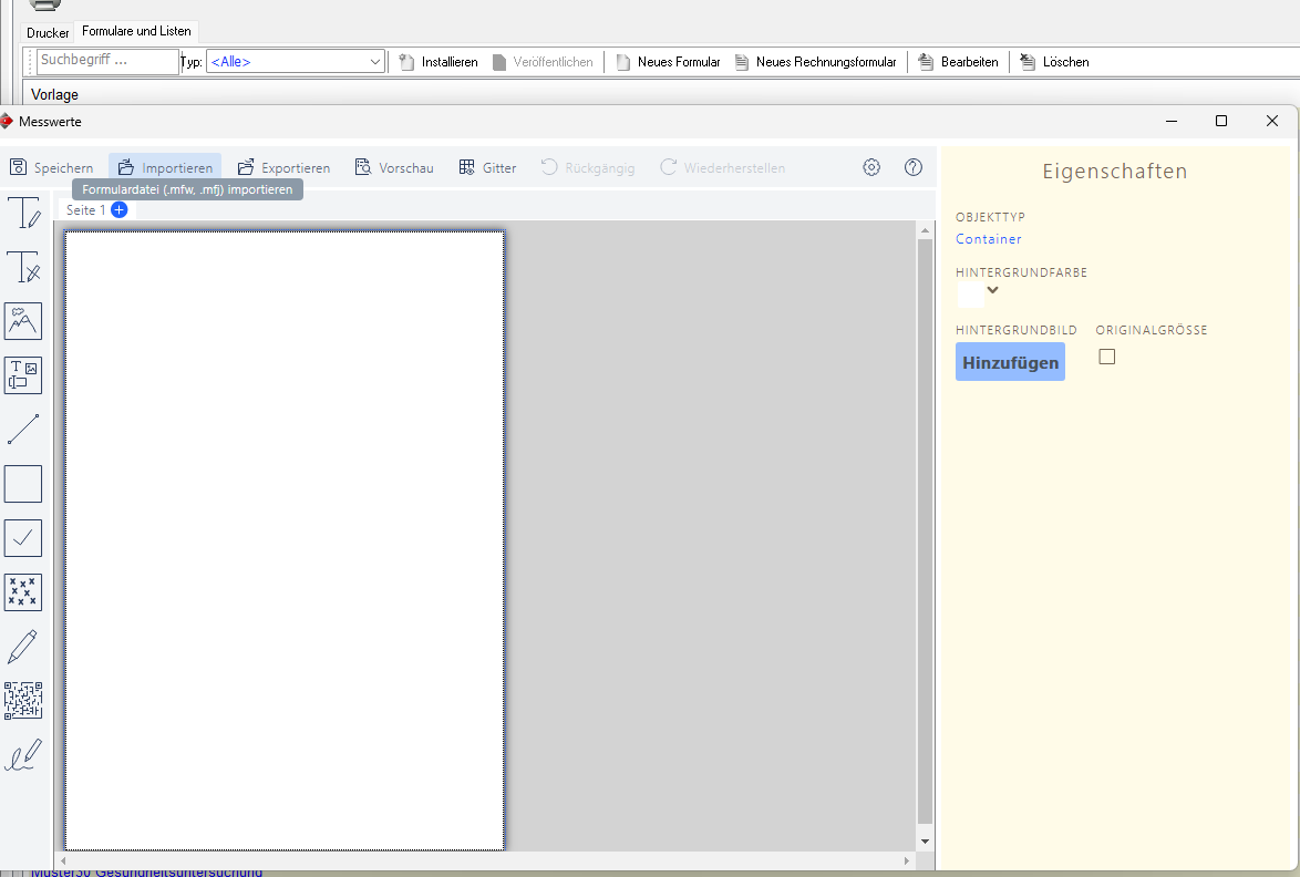 ein neues Formular mit dem neuen Formulareditor erstellen und auf „Importieren“ klicken. (Oder bei Formularanlage per Option „Vorlagendatei“)