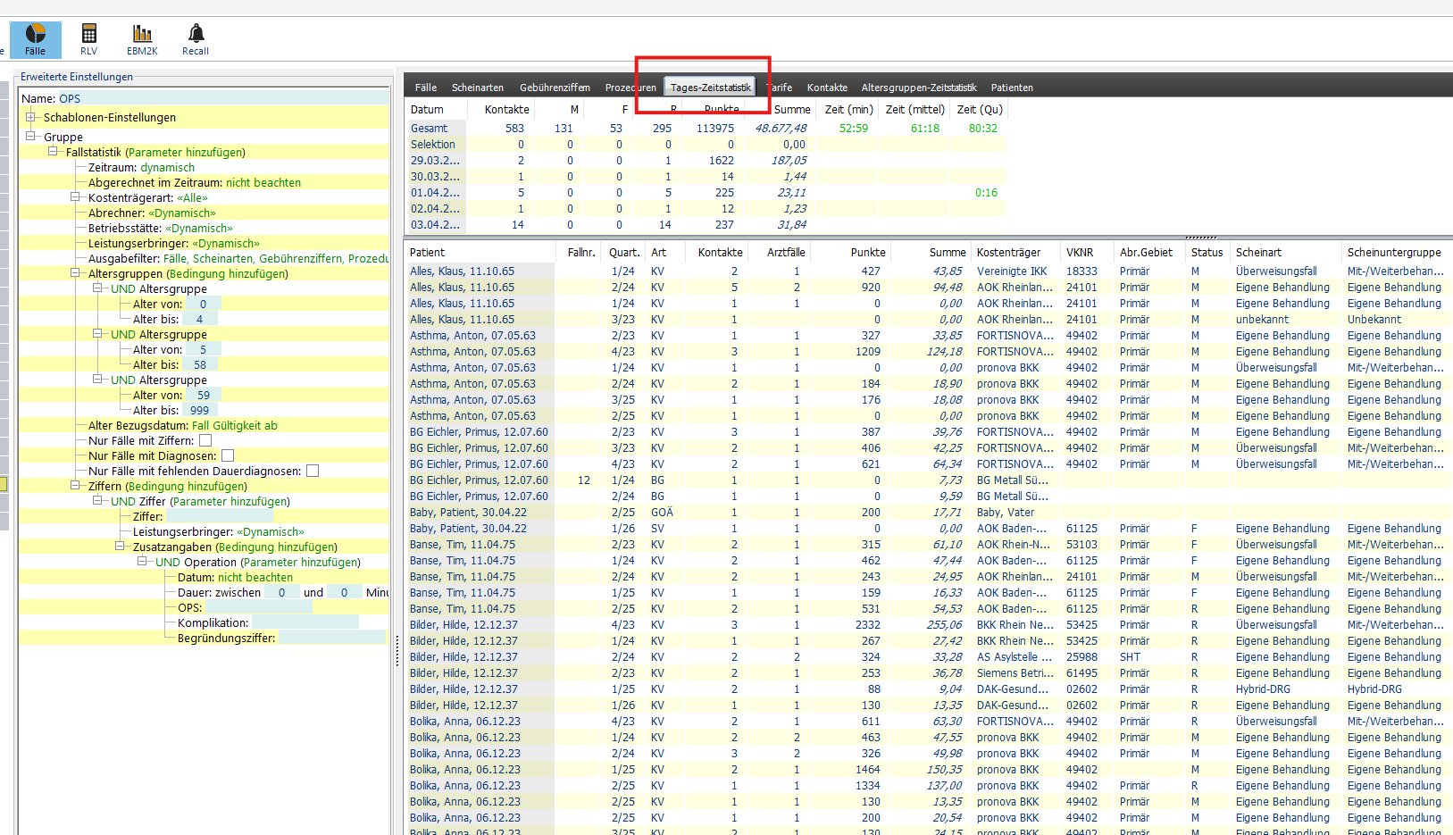 Fallstatistik ist schon richtig. Dort können Sie als Ausgabefilter Tages-Zeitstatistik auswählen. Vermutlich muss das noch eingerichtet werden, damit die richtigen Zeiten ausgegeben werden.